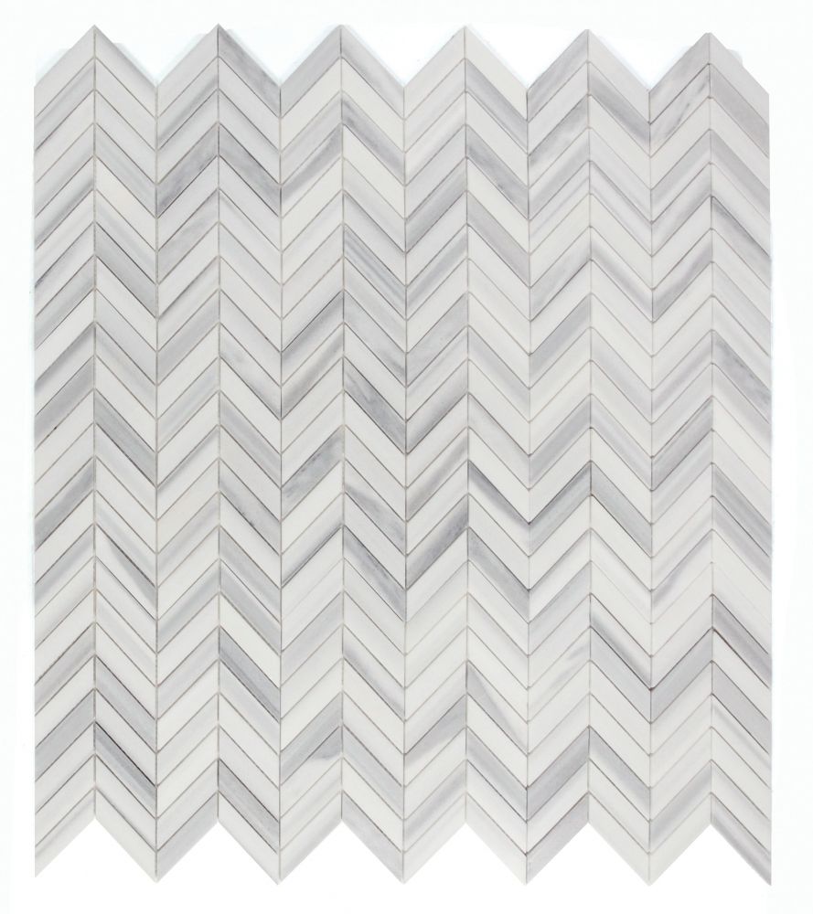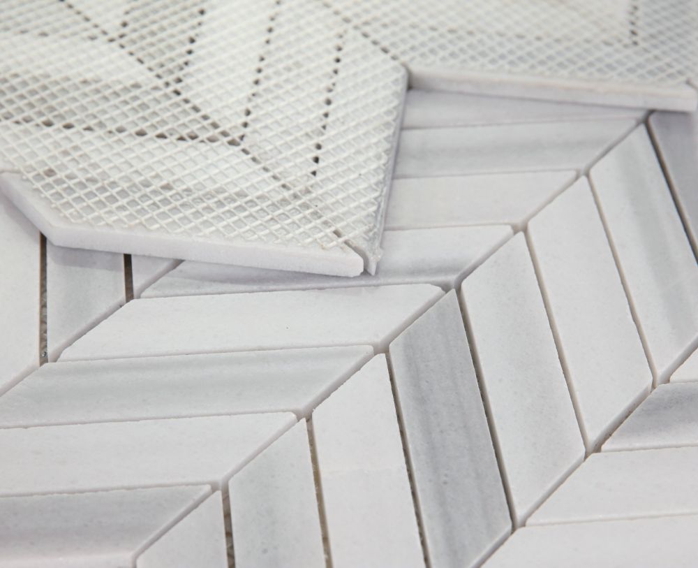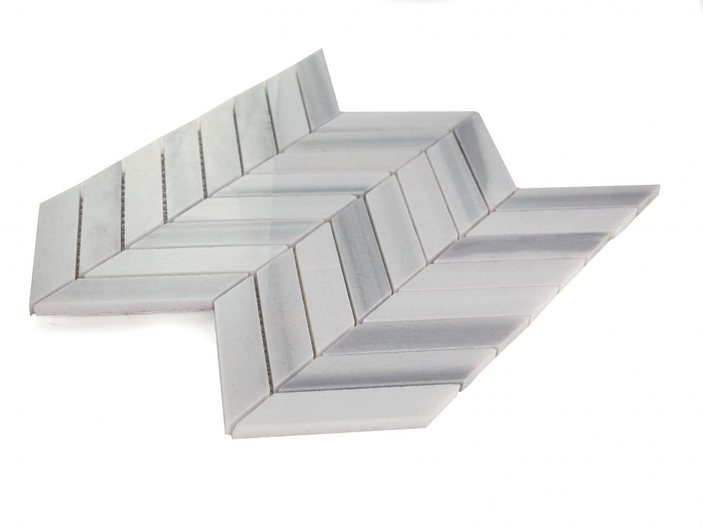 Artisan (by sheet) Chevron & Herringbone Series: Chevron Marmala White 11×11 – White Marmala Marble in Chevron pattern. This Mosaic comes in a Polished finish.