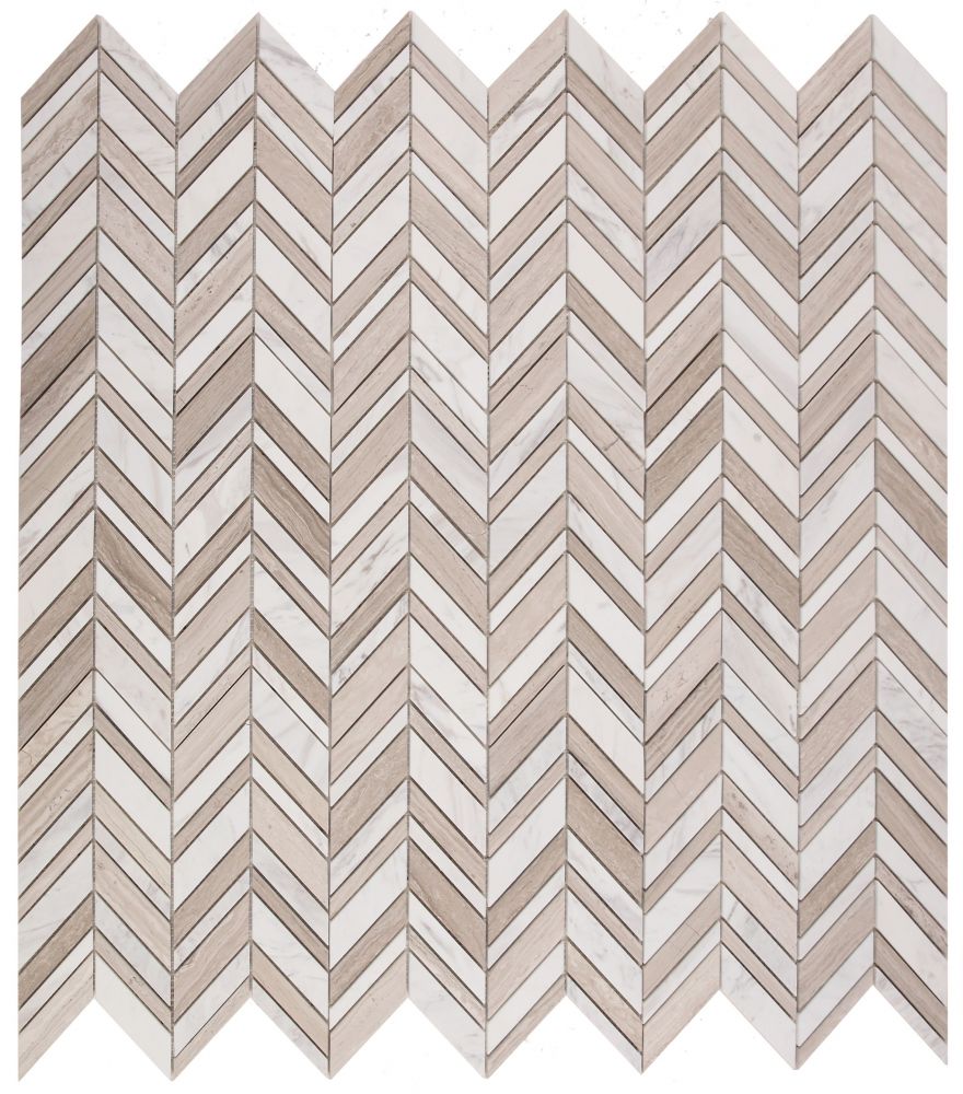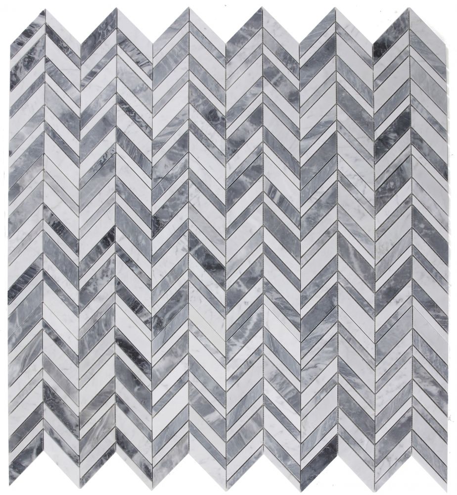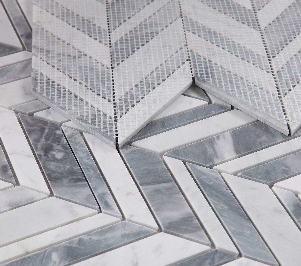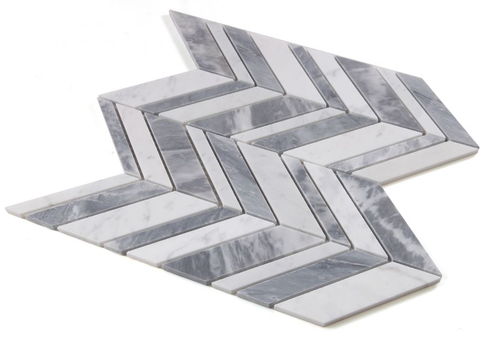 Elegance (by sheet) Chevron & Herringbone Series: Chevron Shadow Lava 11.75×12 – A mix of Carrara and Italian Grey Marble in Chevron style mosaic. Chevron Shadow Loft 11.75×12 – A mix of Volakas White Marble and Haisa Grey Marble in Chevron style mosaic.