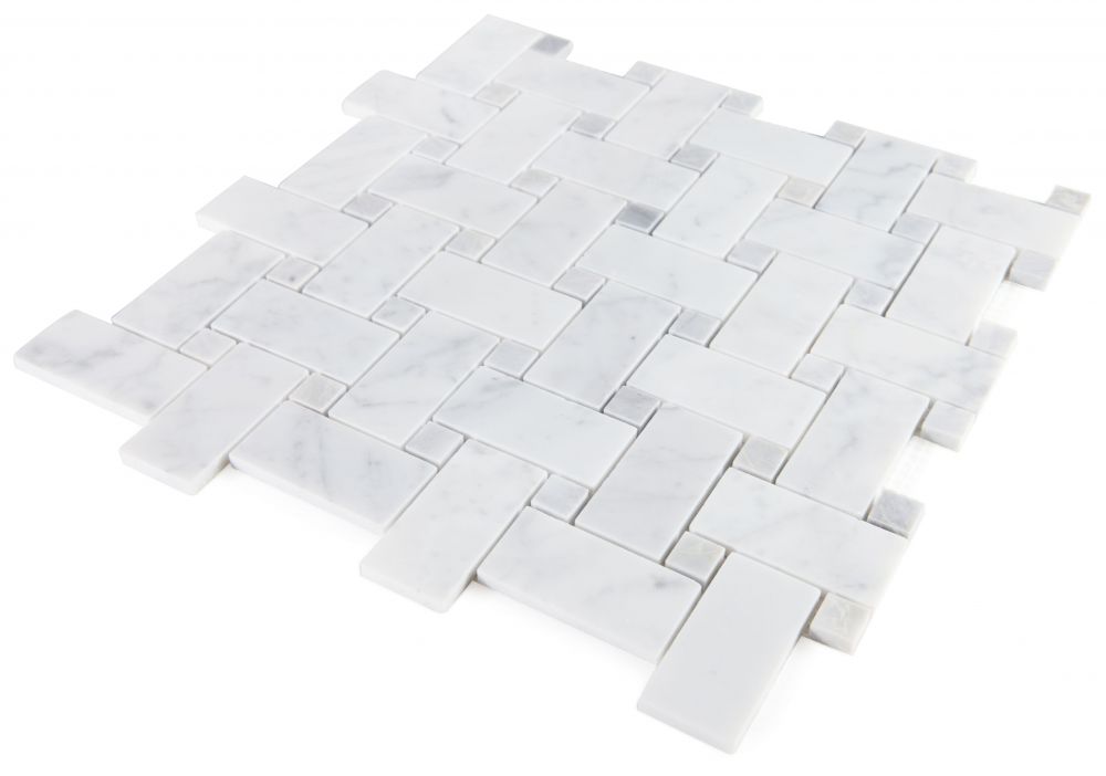 Elegance (by sheet) Calacatta Loft 12×12 Precious Stone Series – Italia Carrara White marble mixed with Bardiglio Grey marble in Pinwheel Pattern.