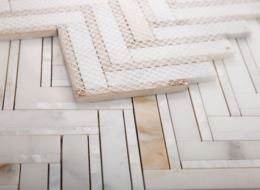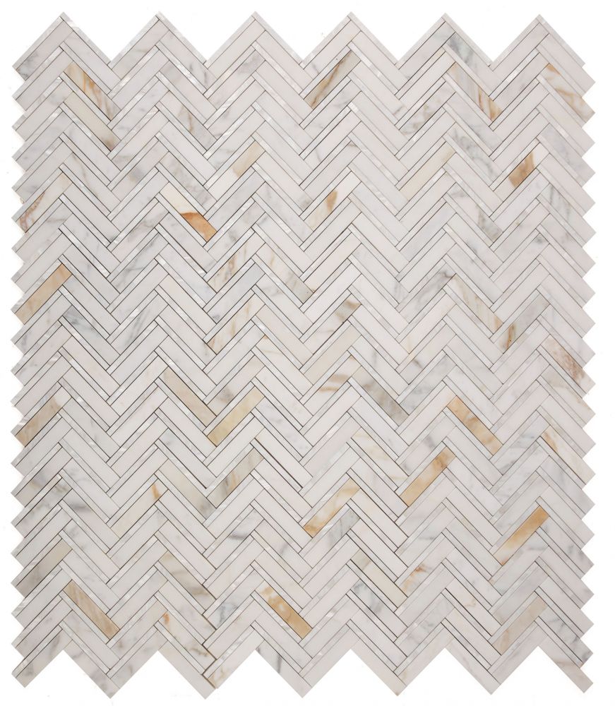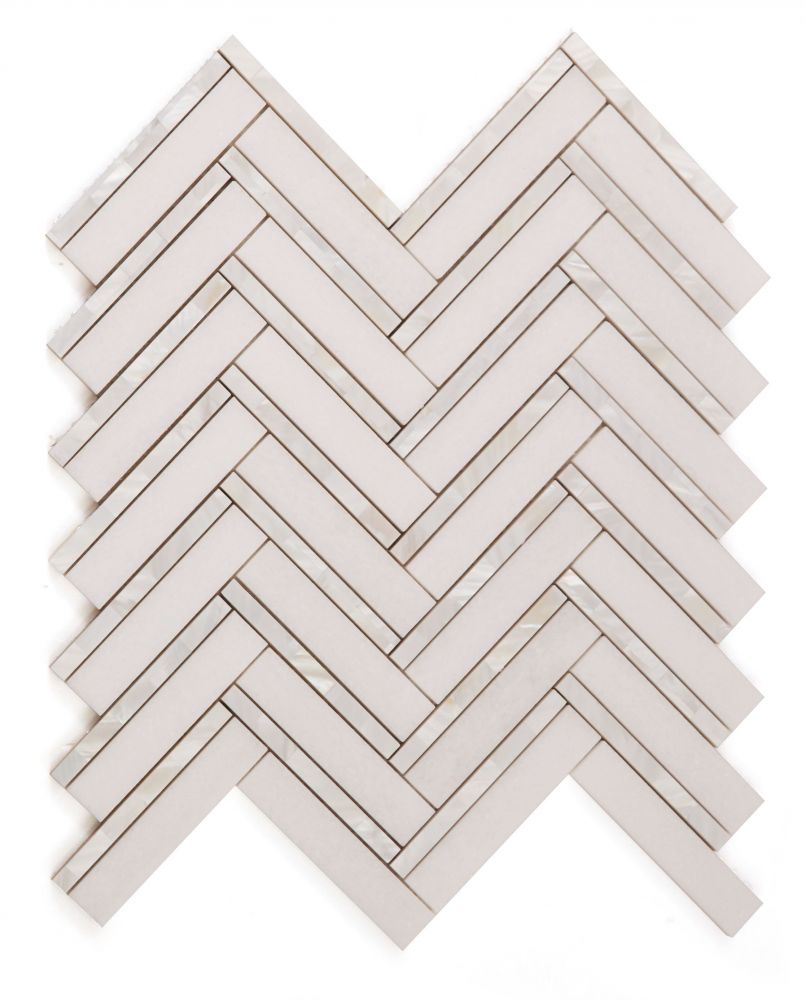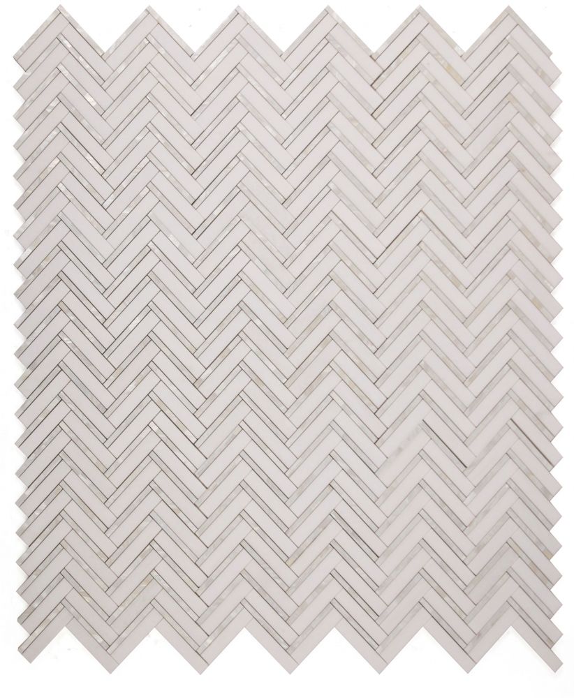 Serenity (by sheet) Diana Herringbone Calacatta 11 x 11.75 – Herringbone style mosaic made up of a combination of Calacatta Gold Marble and Mother of Pearl. Diana Herringbone Thassos 11 x 11.75 – Herringbone style mosaic made up of a combination of Thassos Marble and Mother of Pearl. Glass tile thin-set required.