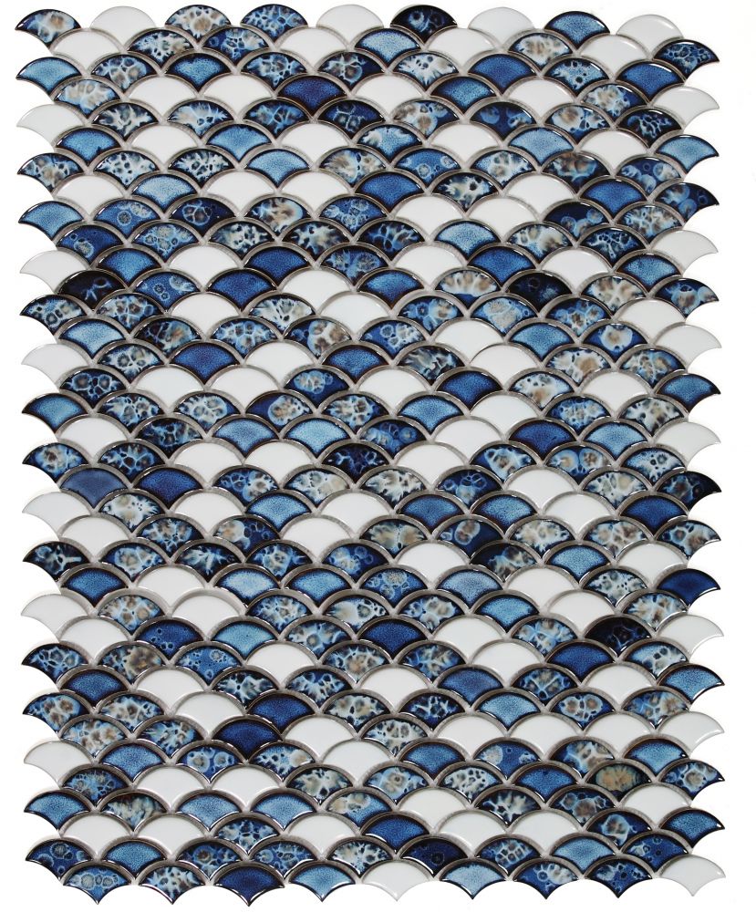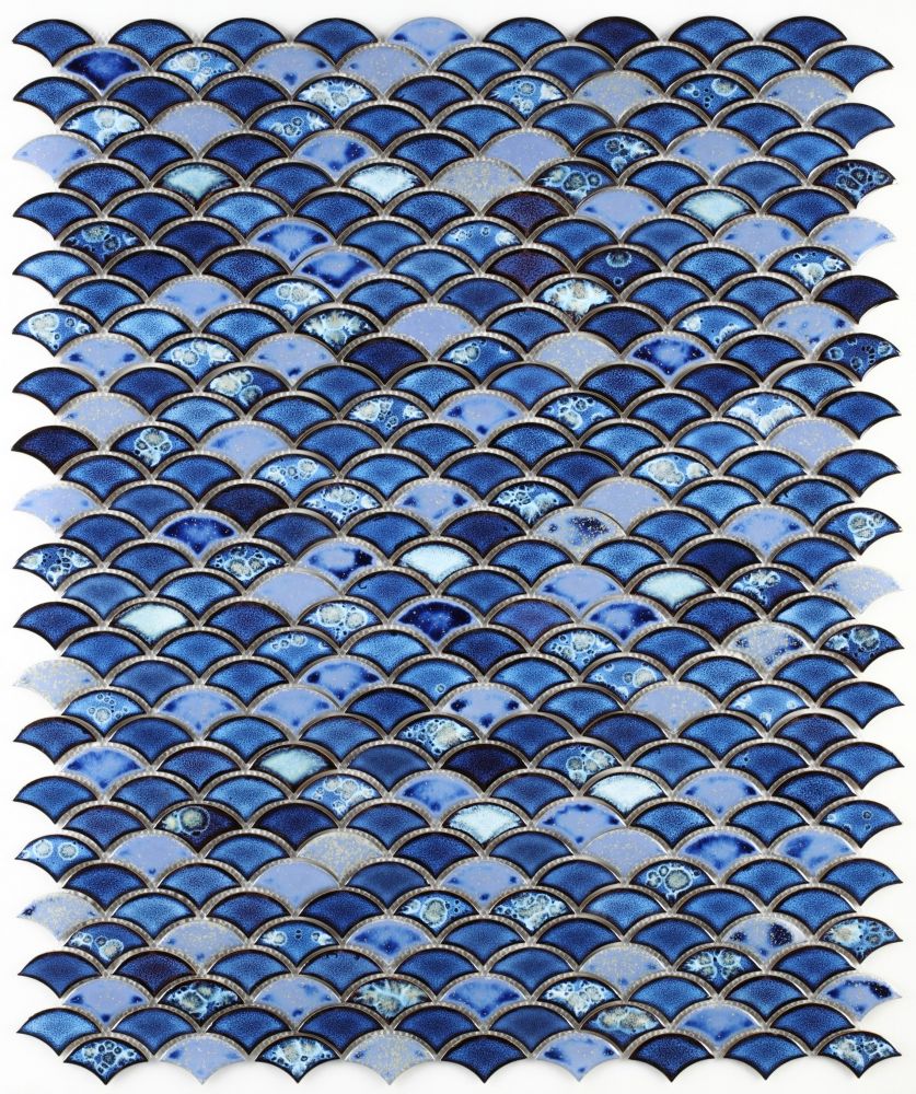 Elegance (by sheet) Navy – Multi-blue porcelain mosaic in a Dragon Scale pattern. Ocean – White with decorative Blue porcelain mosaic in a Dragon Scale pattern. Royal Blue – Rich royal blue color with nice varying design in a Dragon Scale pattern. (13 pcs / box)(72 boxes / pallet). Pool Rated for use in Swimming Pools (Chlorine & Salt Water).