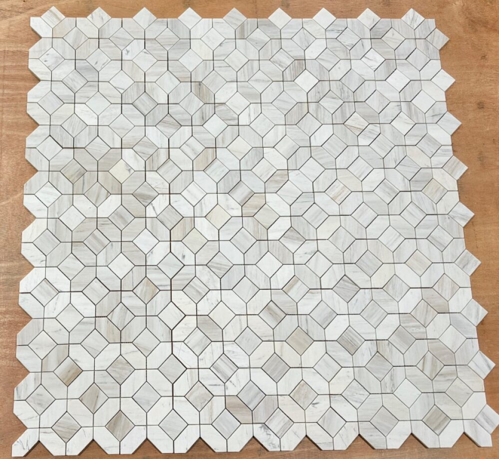 Elegance (by sheet) Eclipse Wooden White Honed: White Eurasian Wood marble in large hexagon deco shape.