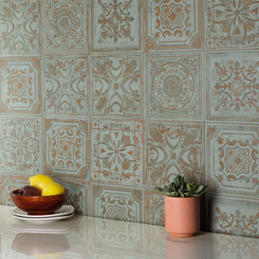 Prestige (by sq. ft.) Ceramic Wall Tile offers authentic vintage appeal. This decorative square tile features embossed old-world motifs in seafoam green and rust color tones with splashes of glossy glazing. With a textured, mixed finish surface, this ceramic tile can blend into virtually any design theme, ranging from contemporary projects to traditional installation. Available in 40 print variations that are randomly scattered throughout each case, the variation throughout each tile mimics an authentic aged appearance. Its glazed feature makes it an ideal choice for indoor wall installations including kitchen backsplashes, bathroom showers, and fireplace facades. Tile is the better choice for your space. This tile is made from natural ingredients, making it a healthy choice as it is free from allergens, VOCs, formaldehyde, and PVC.