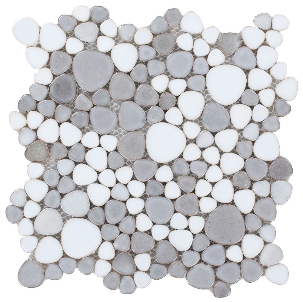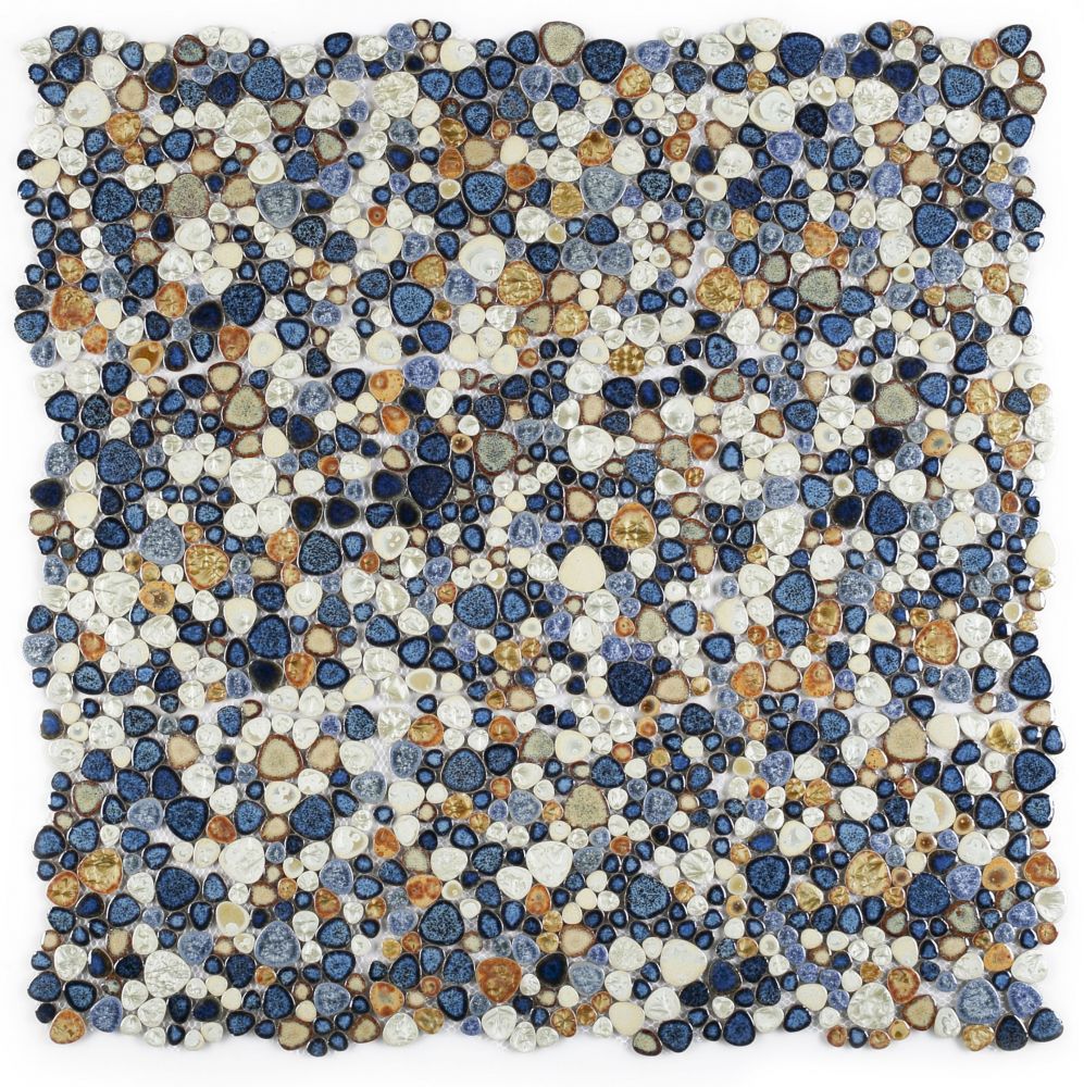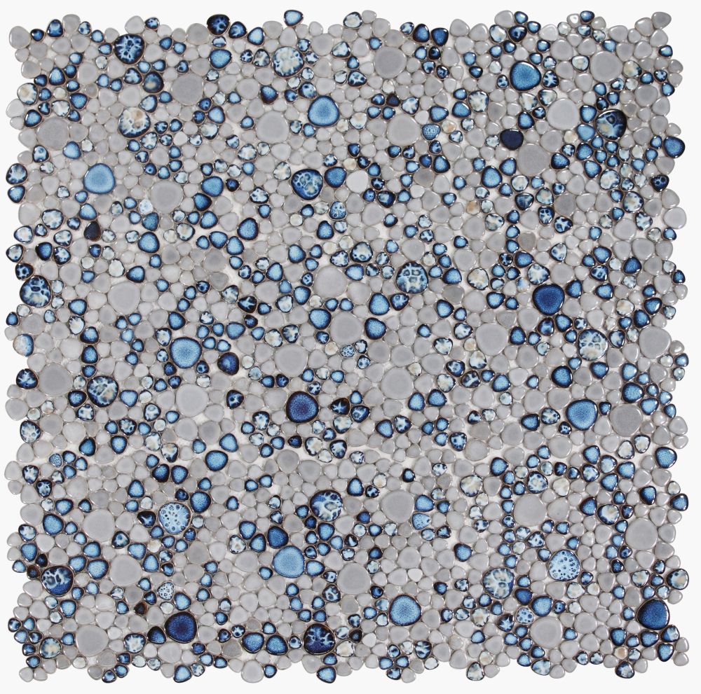 Elegance (by sheet) Growing Atlas (17pc/bx) (63bx/plt), Azure, Blue – MultiBlue & Beige Porcelain & brown Handmade Mosaic. Cielo – Flowery blue mixed with grey colored porcelain mosaic. Dusk – A mix of grey and white porcelain. Small, heart-shaped pieces. Pool Rated for use in Swimming Pools (Chlorine & Salt Water)