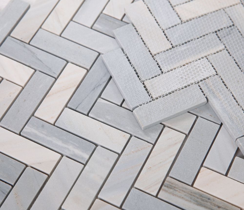 Elegance (by sheet) Herringbone Blue 11×12.5 – Blue Palissandro and Volakas Marble in a Herringbone pattern. Herringbone Italian Blue 11×12.5 – 1″x3″ Blue marble pieces that form a herringbone pattern. Herringbone Italian Grey 11×12.5 – 1″x3″ Italian Grey marble pieces that form a herringbone pattern. Herringbone Marfil 11×12.5 – Thassos and Marfil Marble in a 1×3 Herringbone pattern. Herringbone Green 11 x 12.5 – 1×3 Green Onyx pieces in a herringbone pattern.