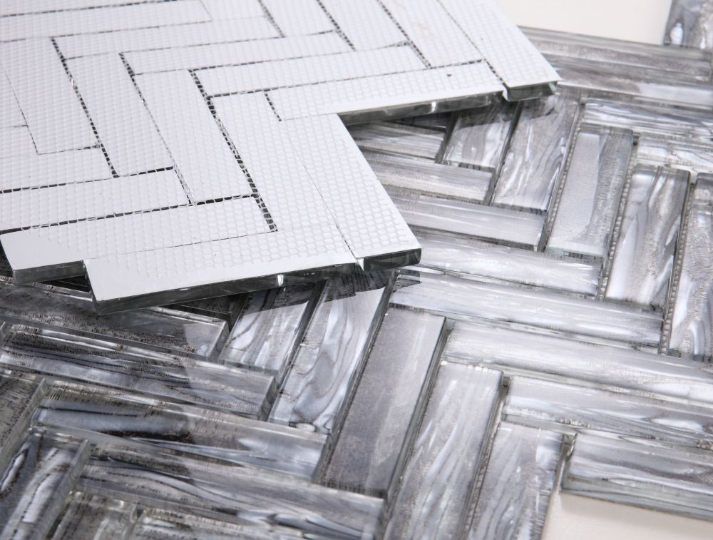 Elegance (by sheet) Herringbone Shell Silver 11.25×11.25 – Artistic shell design on 1×4 glass pieces to create a herringbone pattern mosaic. Glass Thin-set is required for installation. ***This Glass tile is NOT rated to be installed in fireplaces or any area near an open flame***