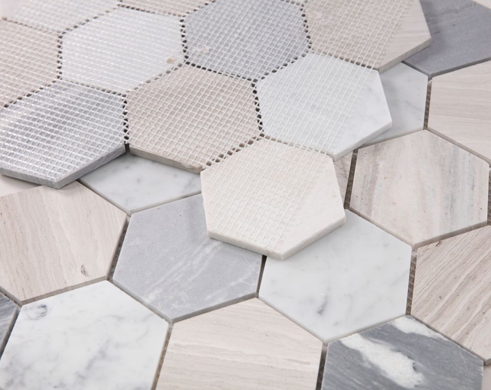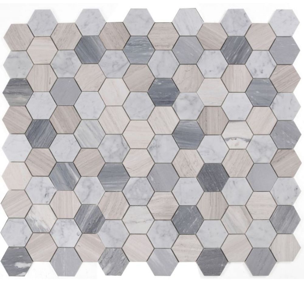 Elegance (by sheet) Hexagon Blue Large 4 x 4 10.75×12.5 – A mix of Carrara and Blue Palissandro marble in 4×4 hexagon pieces.