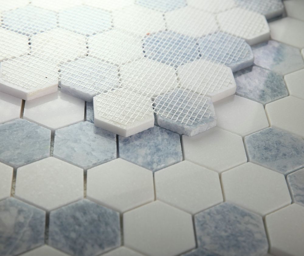 Serenity (by sheet) Hexagon Crystal Ocean 11.75×12 – 2×2 Hexagon mosaic with a blend of Blue Crystal and Thassos Marble.