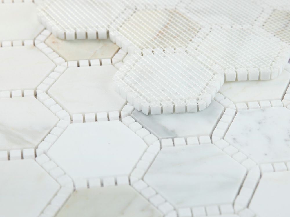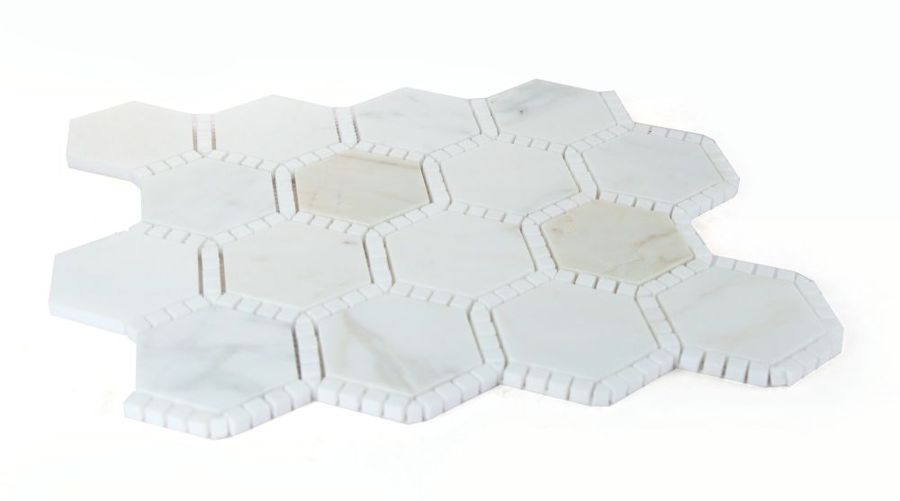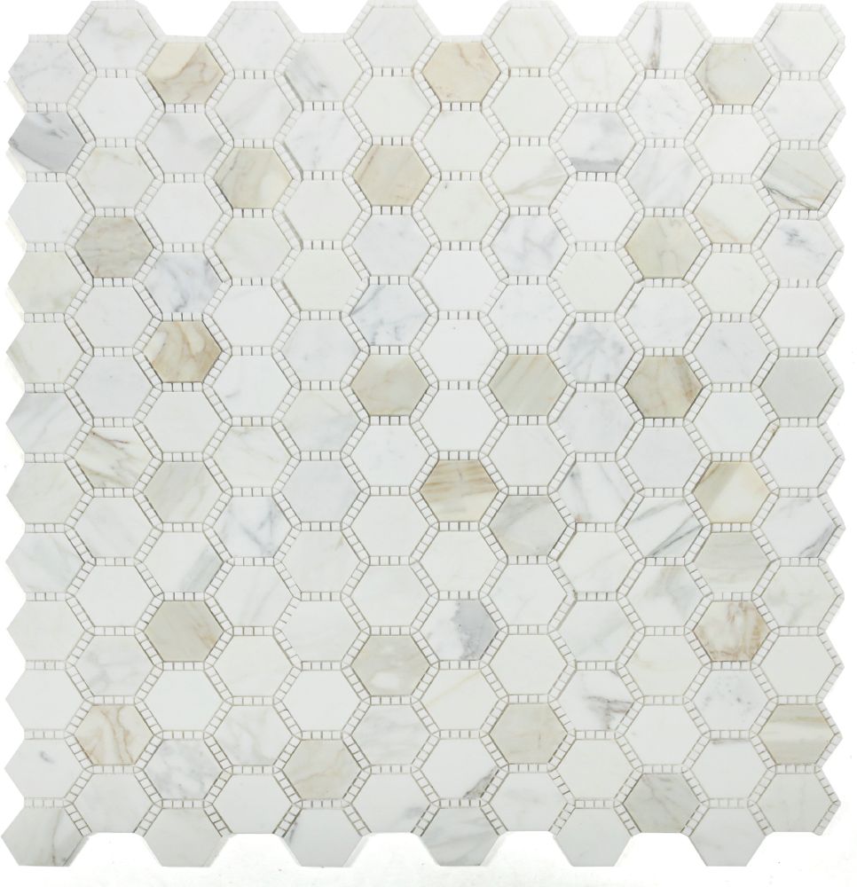 Forever (by sheet) Hexagon Deco Calacatta Gold Honed 10.75×12.5 : Calacatta Gold Marble in large hexagon shape circled by white thassos marble. Calacatta Gold, Greece Thassos White.