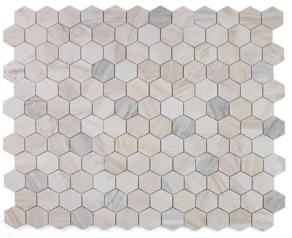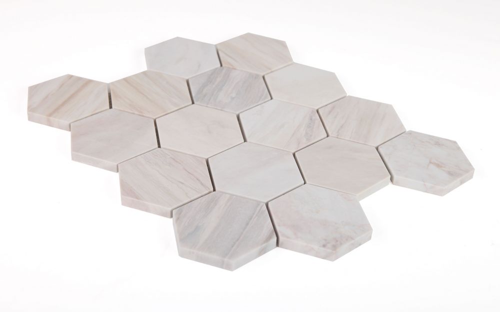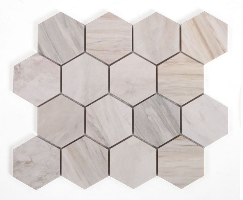 Elegance (by sheet) Hexagon Euro Honed 3 x 3 10 x 11.25 – Hexagon mosaic made of 3×3 pieces of Eurasian Marble.