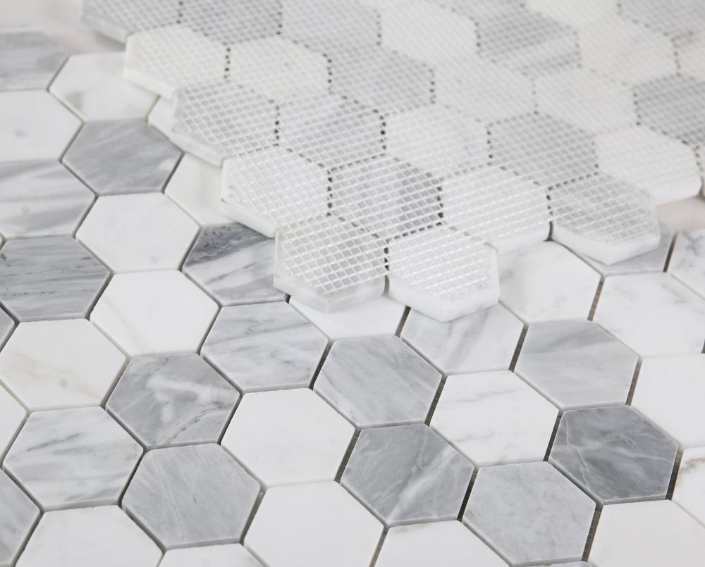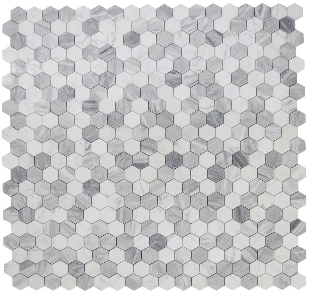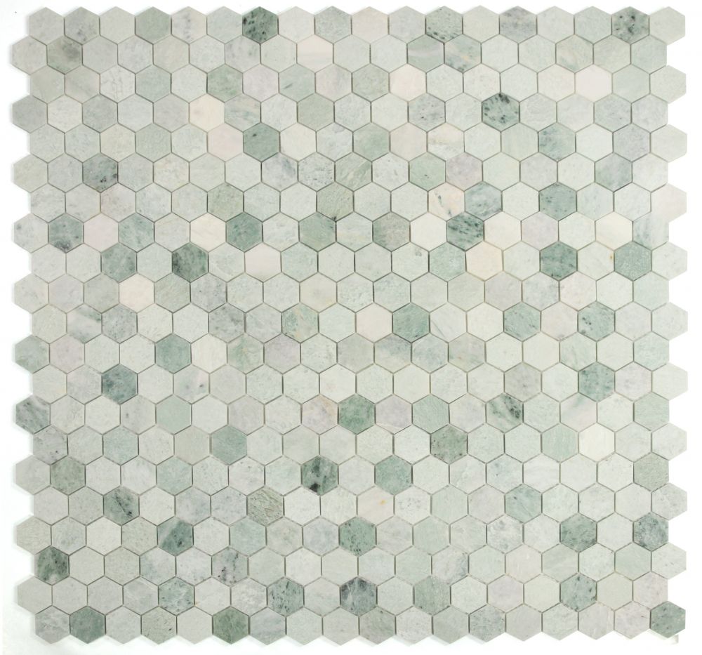 Elegance (by sheet) Hexagon Beach – Hexagon mosaic with a blend of Thassos and Palissandro Blue Marble. Hexagon Dusk – Mix of Carrara and Bardiglio Marble hexagon pieces. Hexagon Green – Hexagon mosaic made of Ming Green Marble.