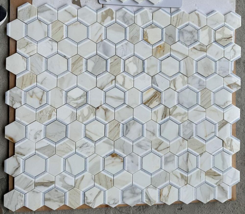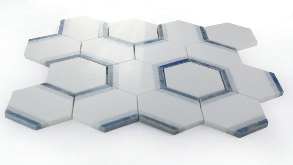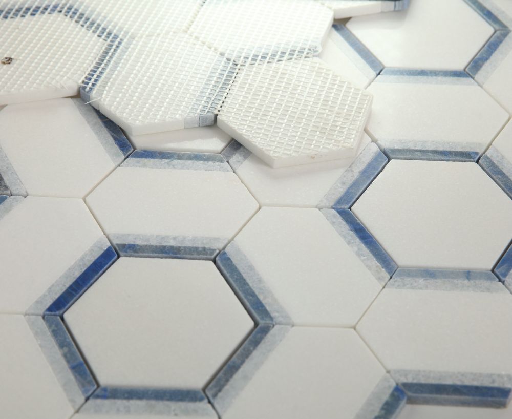 Serenity (by sheet) Hexagon Royal Calacatta Gold 12 x 13.75 -Calacatta Gold, Greece Thassos White, Azul Cielo. Hexagon Royal Sapphire 12 x 13.75 – Made from a combination of Azul Cielo (Argentina Sky Blue), Azul Macaubas/Macobus, and Greece White Thassos.
