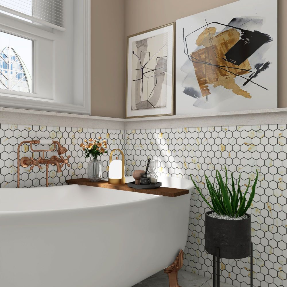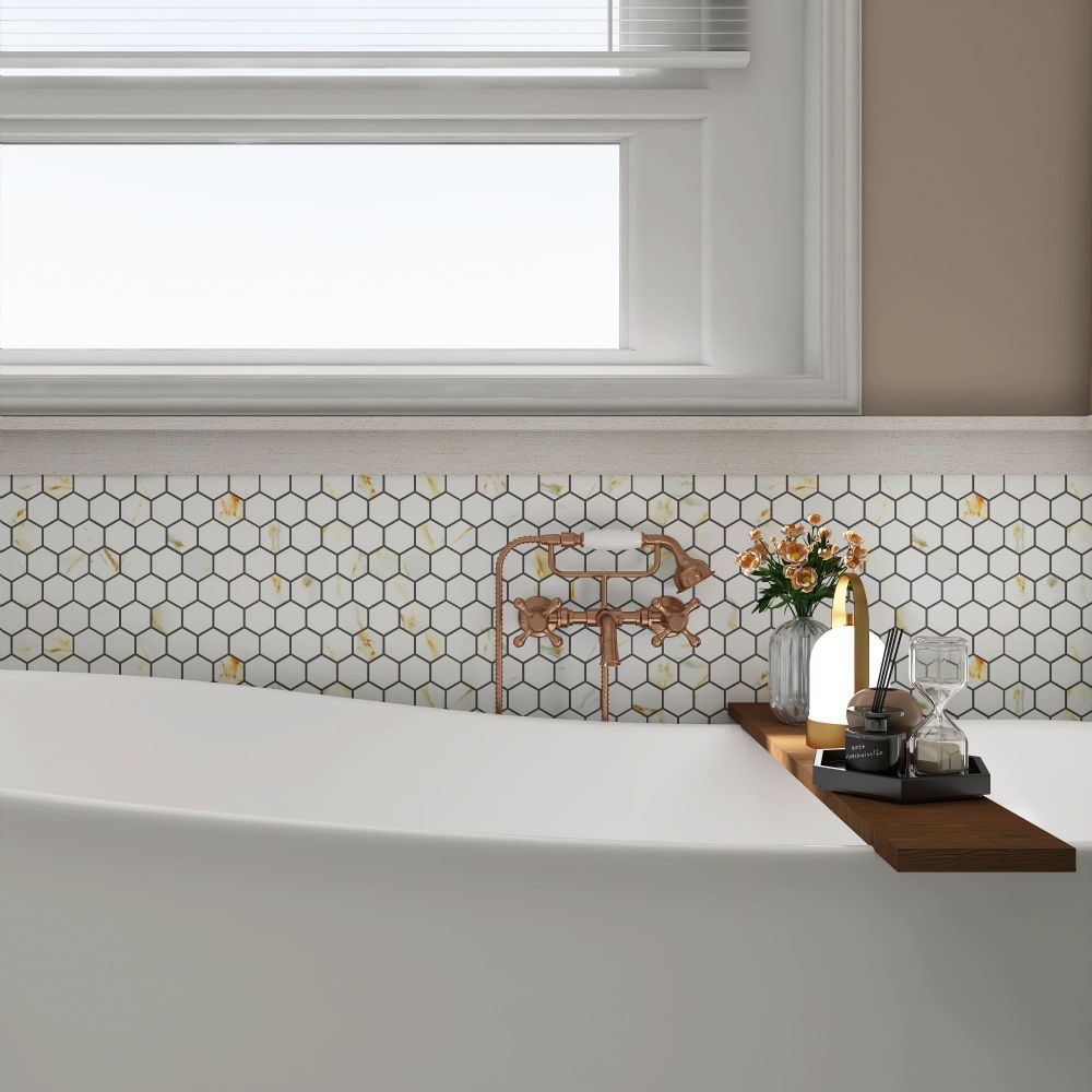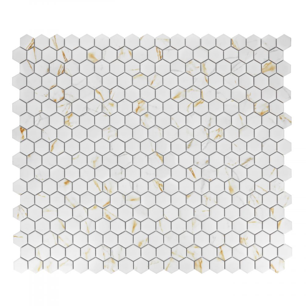 Prestige (by sheet) Hulu Hexagon Calacatta Matte 2 x 2 11 x 12.75 – Hexagon mosaic made of porcelain. Pool Rated for use in Swimming Pools (Chlorine & Salt Water)