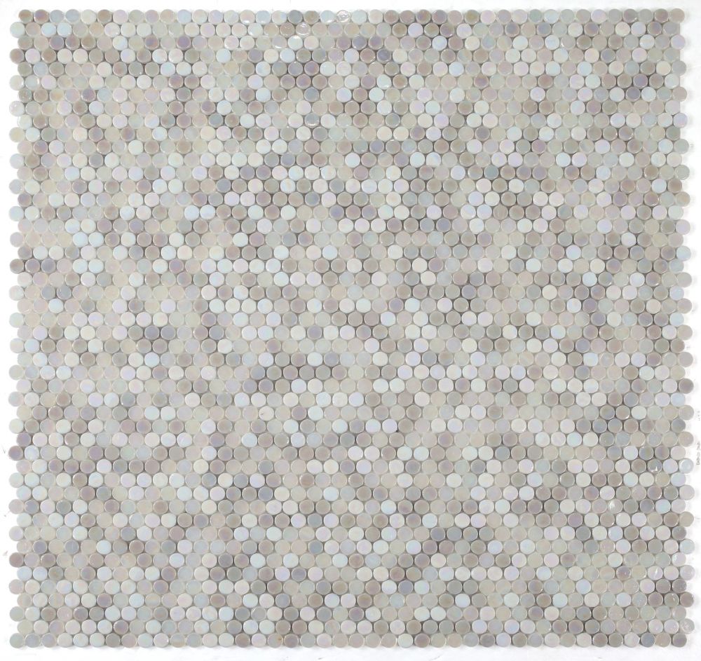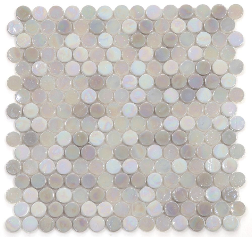 Elegance (by sheet) Inari Penny New 11.75 x 11.75: Grey, White and Iridescent textured glass in penny pattern 11.75×11.75. Glass tile thin-set required. Pool Rated for use in Swimming Pools (Chlorine & Salt Water)