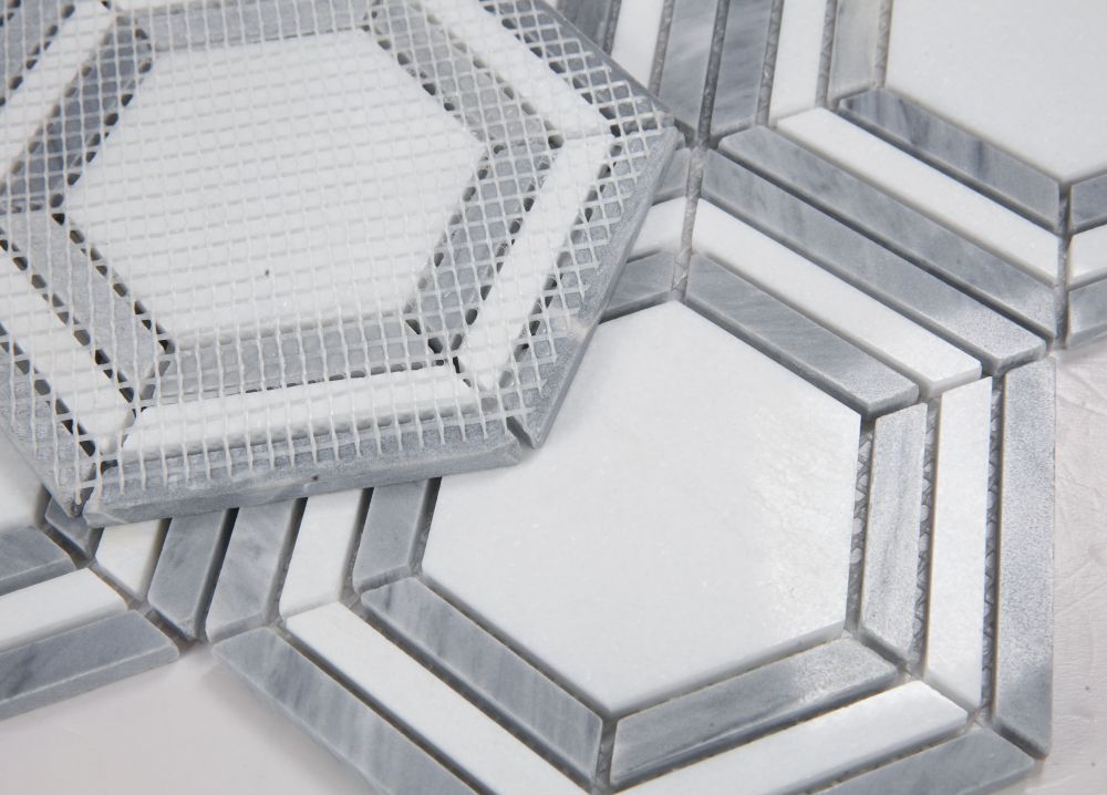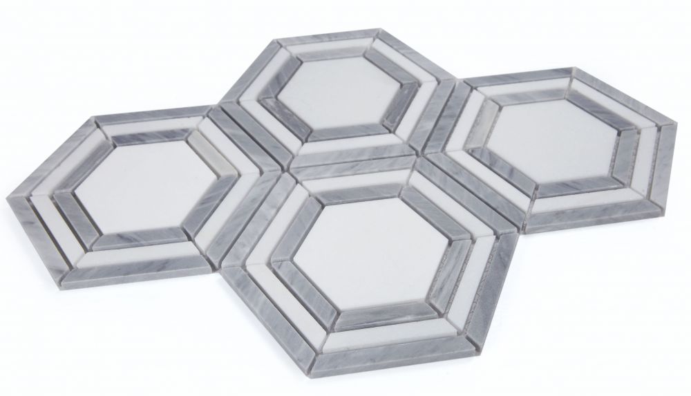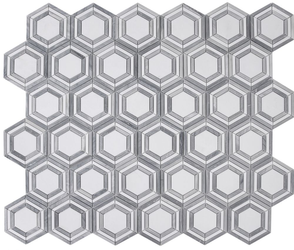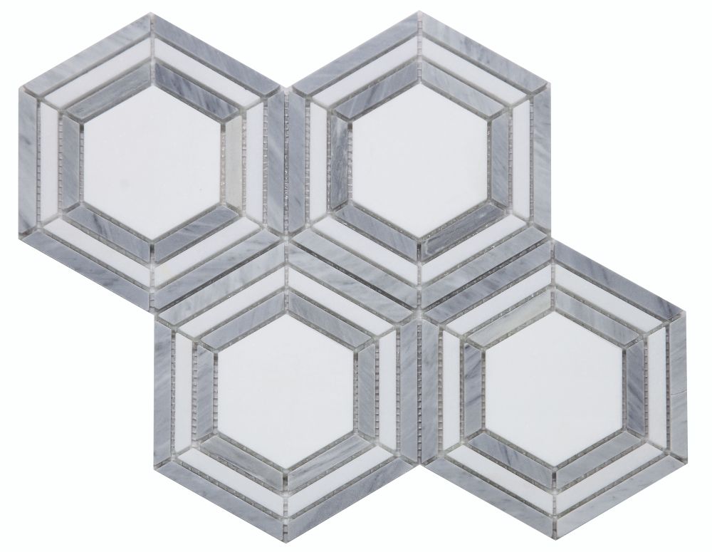 Forever (by sheet) Nancy Blue 10.75 x 12.25 – Palissandro Blue and Thassos marble mosaic in concentric hexagon pattern. This mosaic comes in a polished finish.