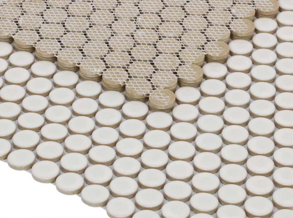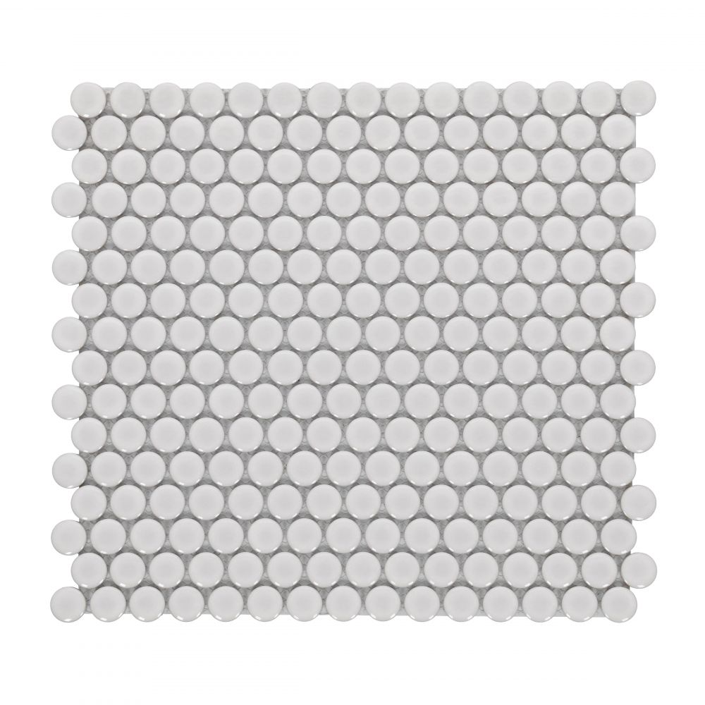 Prestige (by sheet) Penny Round Glossy 11.5×12.25 – Porcelain mosaic in penny-sized pieces. Pool Rated for use in Swimming Pools (Chlorine & Salt Water)