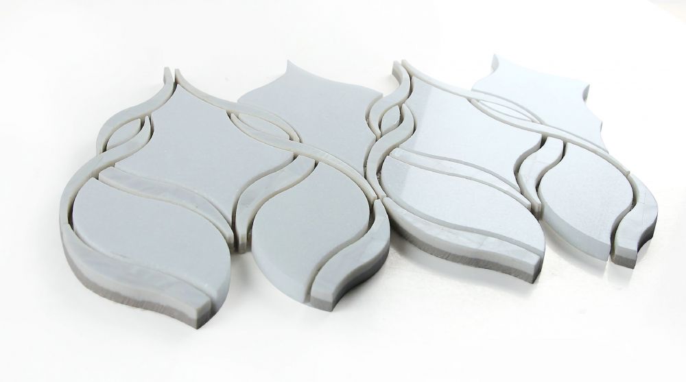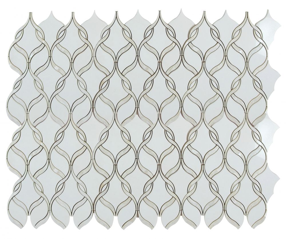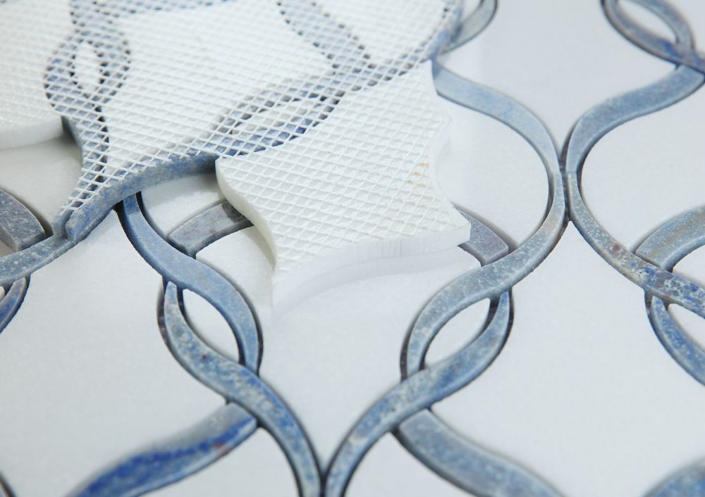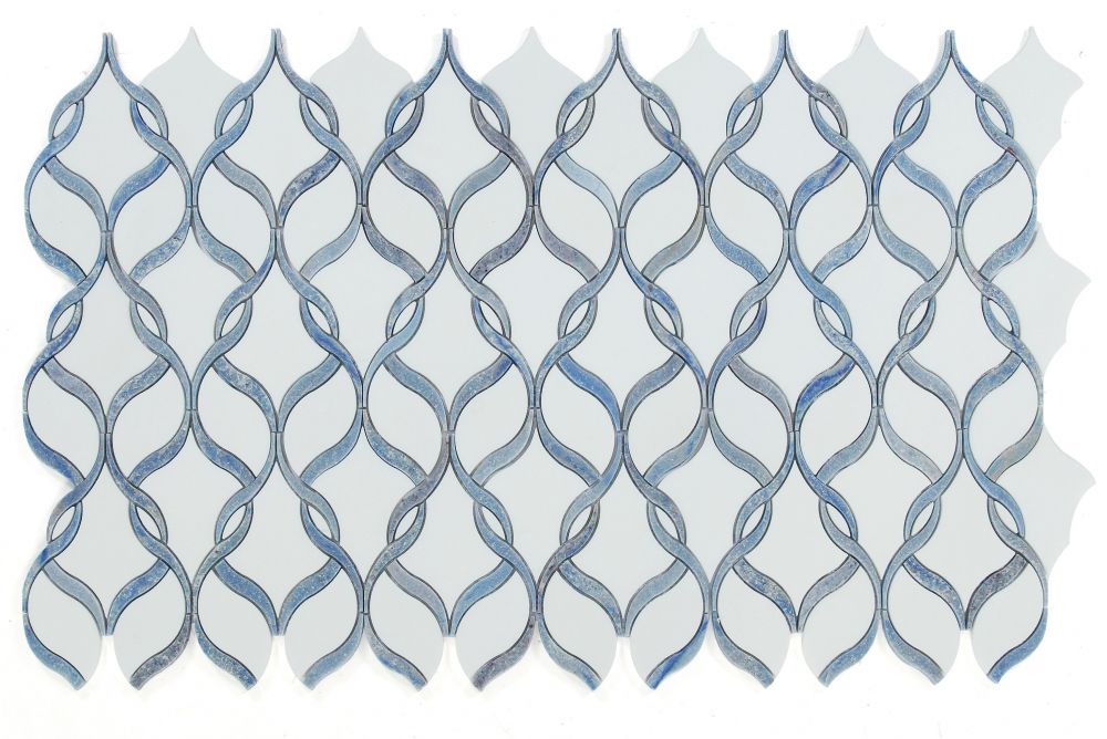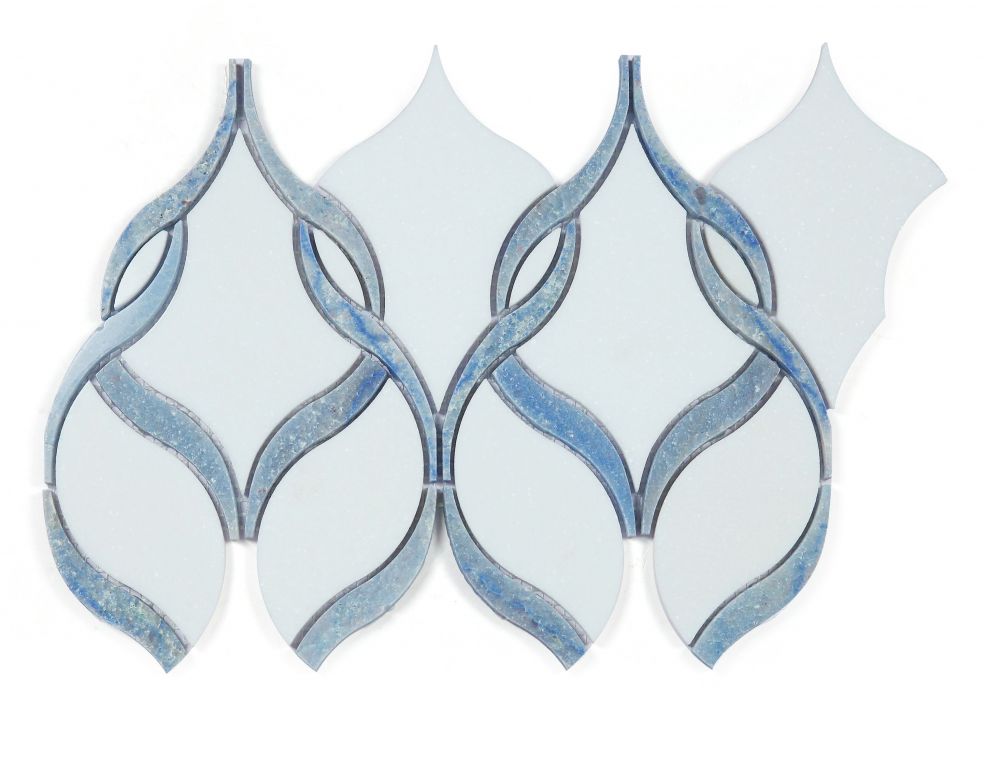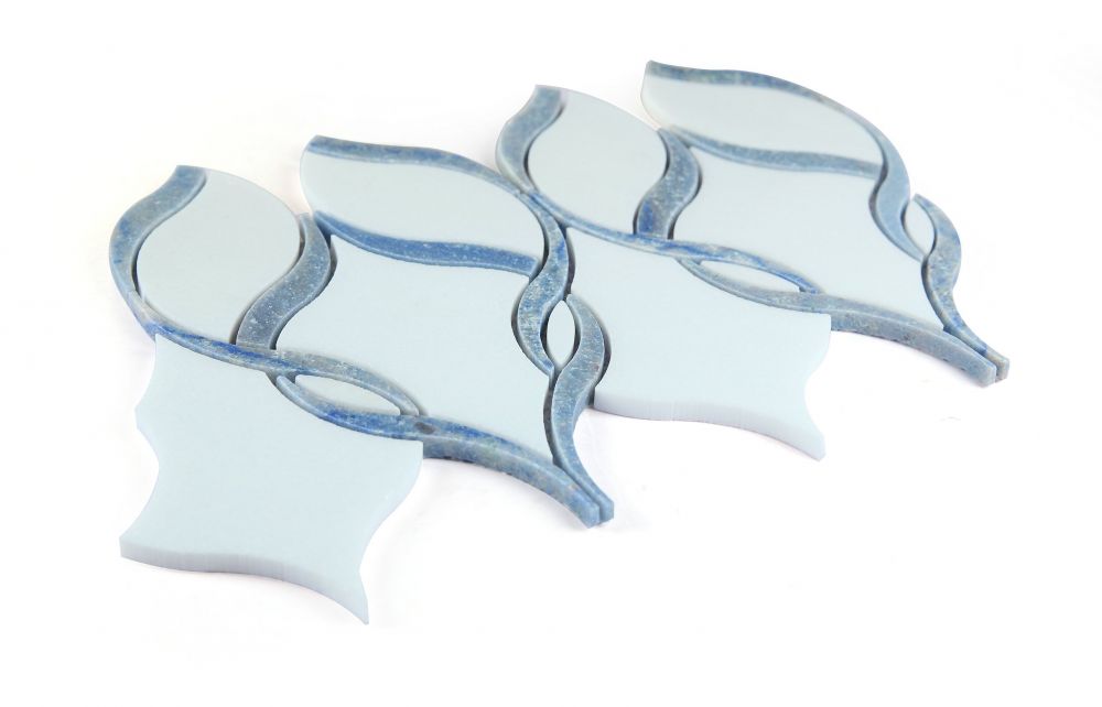 Timeless (by sheet) Prestige Pearl Thassos – Thassos Marble with Mirror Glass precisely cut via Waterjet. Glass tile thin-set required. Prestige Royal Sapphire – Made of Azul Macaubas Quartizite and White Thassos marble. Prestige White – Calacatta White marble with mirror glass in wave layout. Glass tile thin-set required.