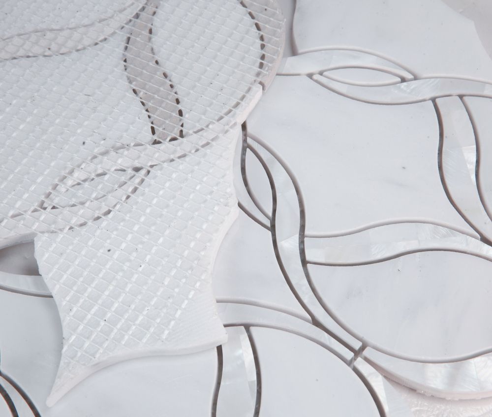 Timeless (by sheet) Prestige Pearl Snow 7.25×12 “- Waterjet mosaic, snow white marble with white pearl in artistic pattern. Glass tile thin-set required.