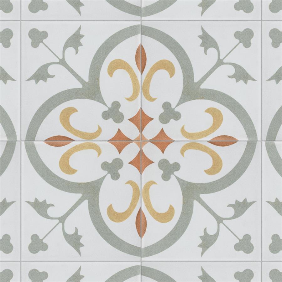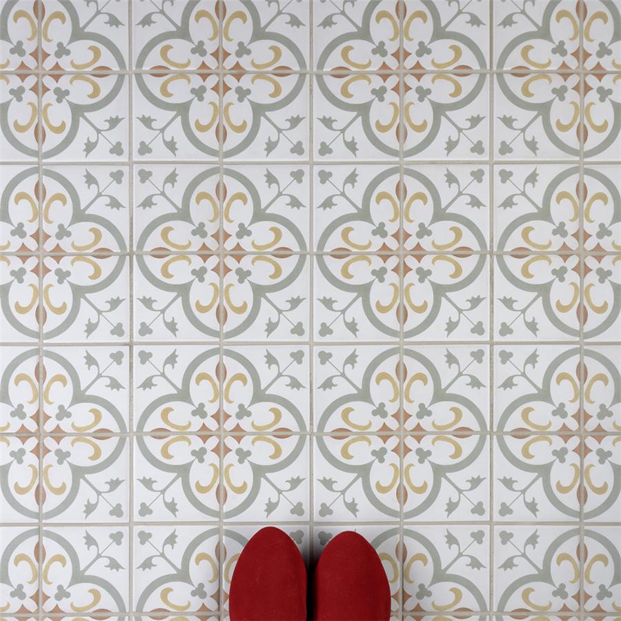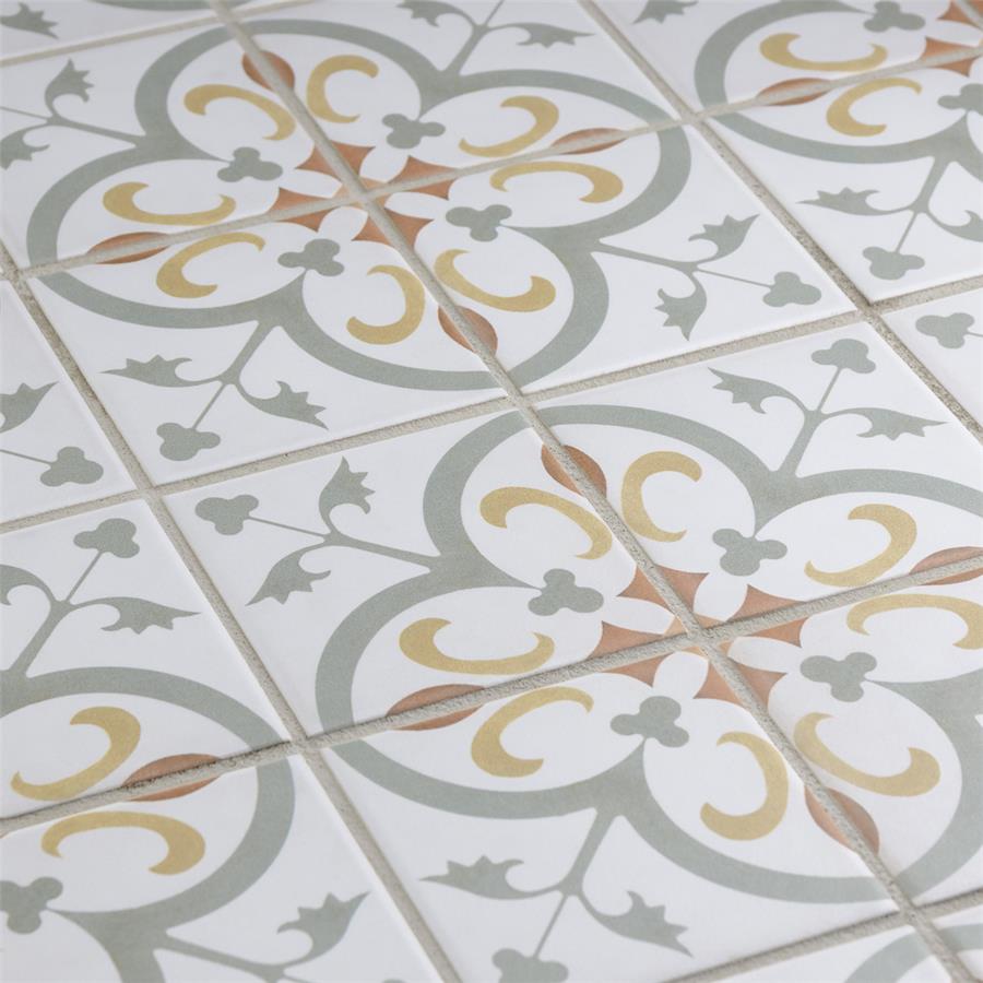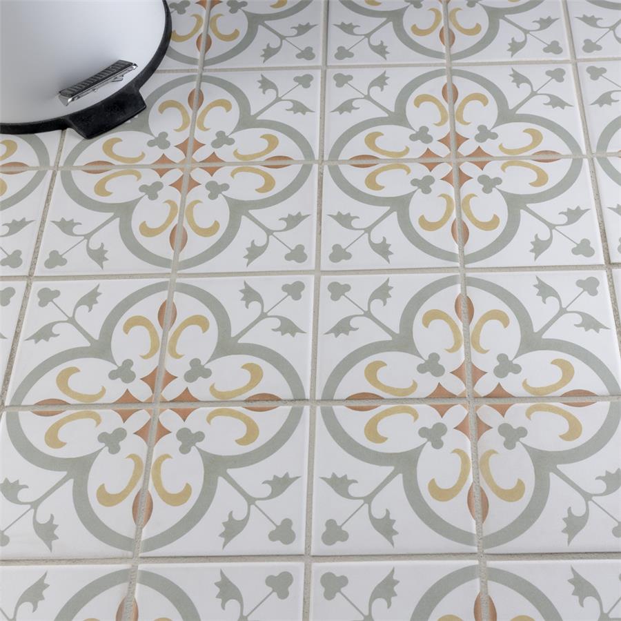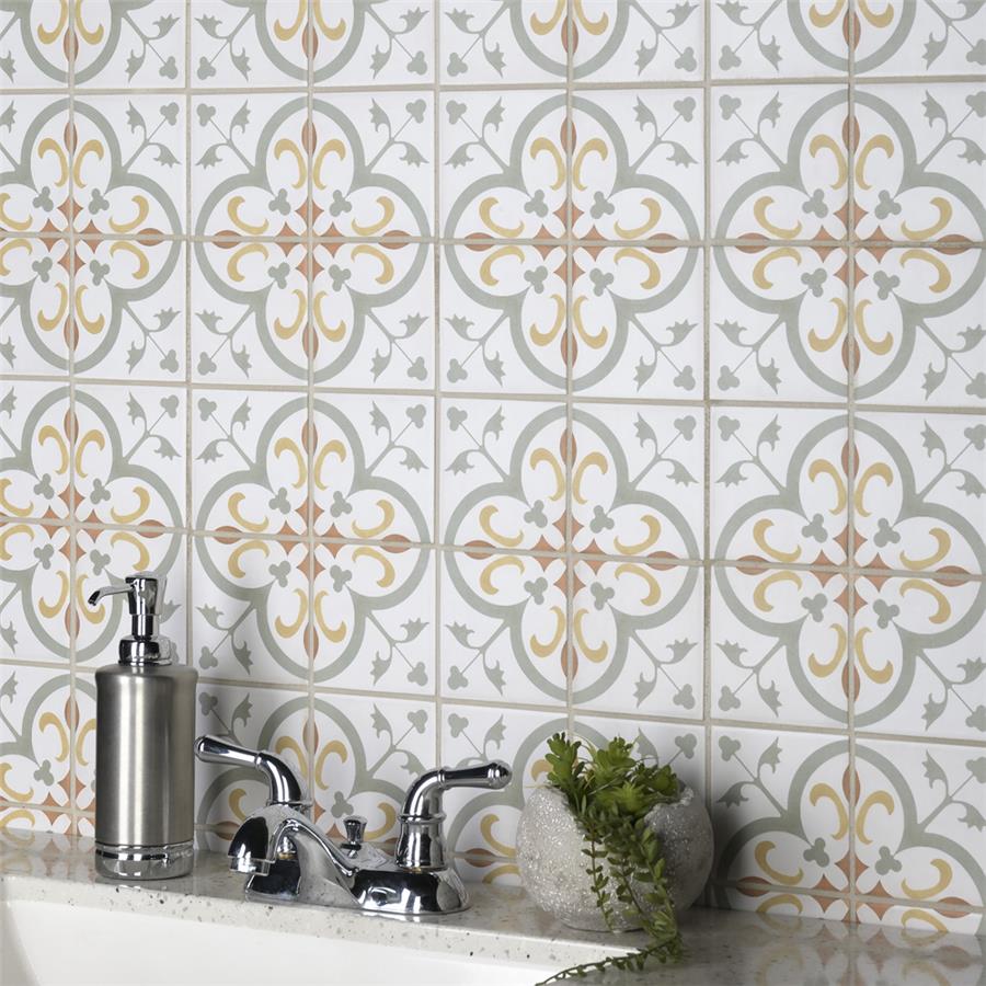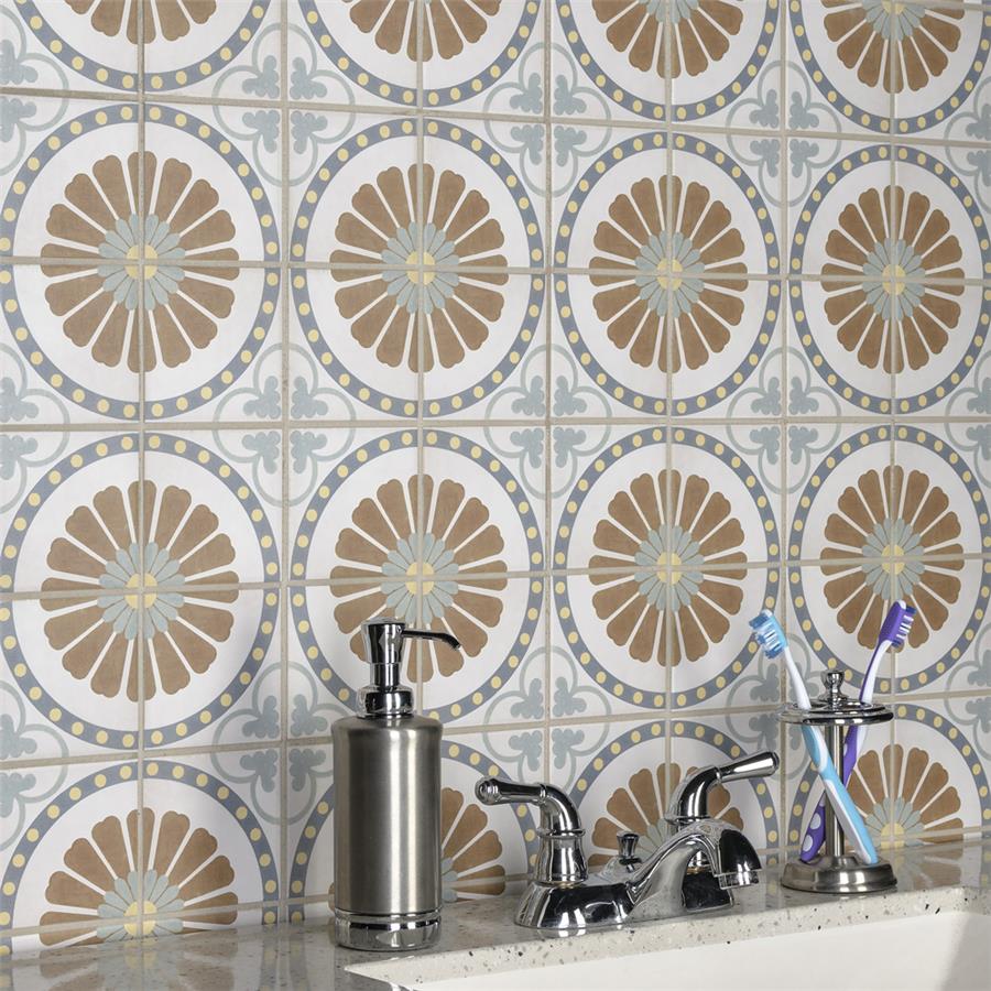 Ambiance (by sq. ft.) Ceramic Floor and Wall Tile transforms any space into a work of art through geometric and linear patterns that when laid out, intertwine to create captivating floral motifs. Inspired by our Revival 7-3/4 in. x 7-3/4 in. Ceramic Floor and Wall Tile, this smaller version is composed of rich detail and a smooth surface texture, this floor and wall tile features varying shades of faded orange, yellow, and blues on an off-white base glaze for additional visual dimension. Its durable and frost-resistant features make this an ideal choice for indoor and outdoor installations including kitchens, bathrooms, backsplashes, showers, entryways, patios and fireplace facades.