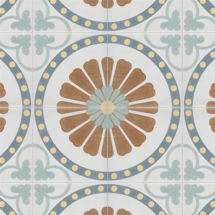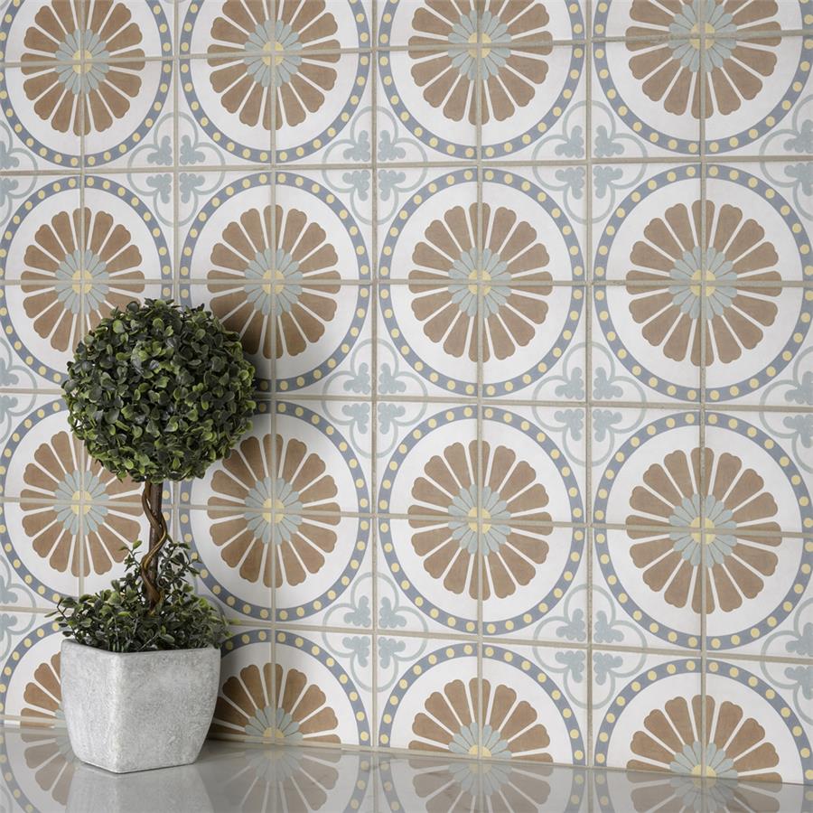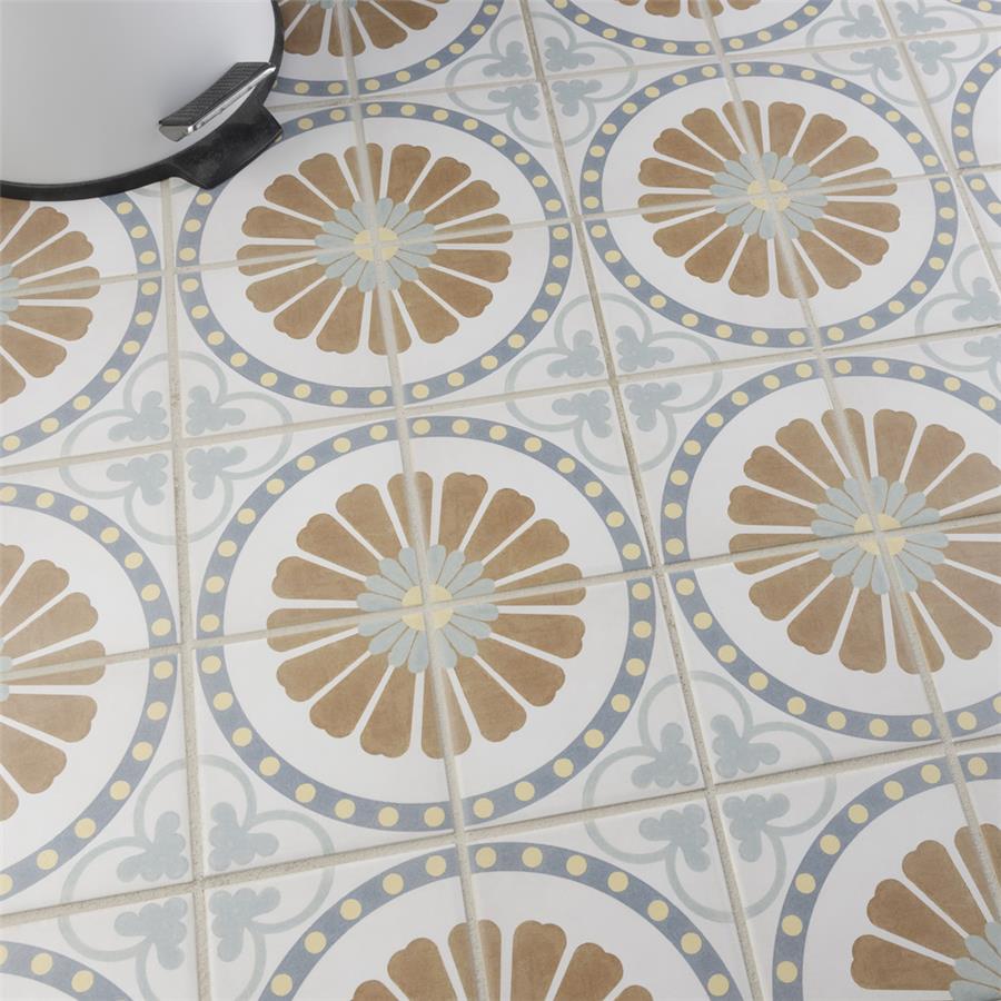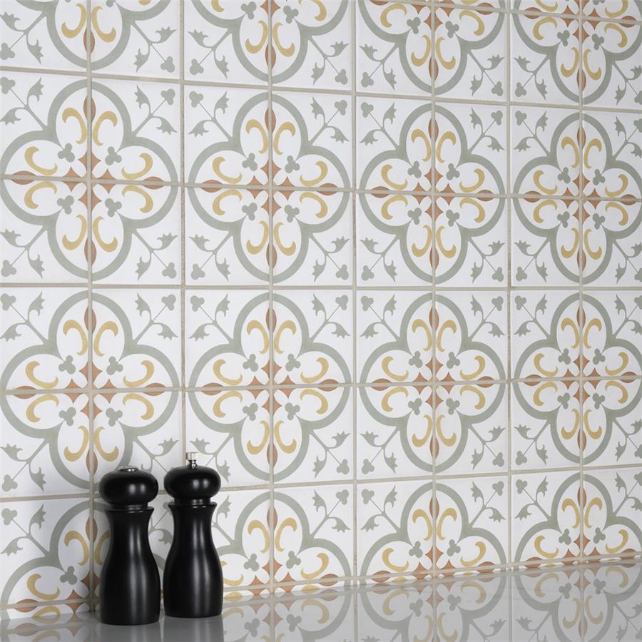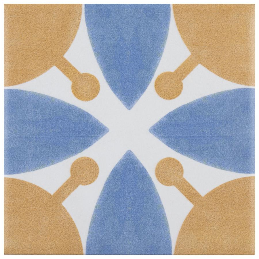 Ambiance (by sq. ft.) Ceramic Floor and Wall Tile transforms any space into a work of art through geometric and linear patterns that when laid out, intertwine to create captivating floral motifs. Inspired by our Revival 7-3/4 in. x 7-3/4 in. Ceramic Floor and Wall Tile, this smaller version is composed of rich detail and a smooth surface texture, this floor and wall tile features varying shades of faded orange, yellow, and blues on an off-white base glaze for additional visual dimension. Its durable and frost-resistant features make this an ideal choice for indoor and outdoor installations including kitchens, bathrooms, backsplashes, showers, entryways, patios and fireplace facades.