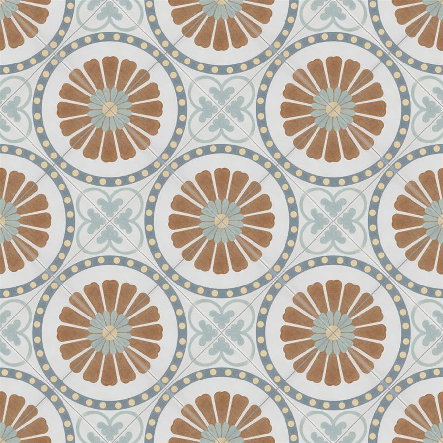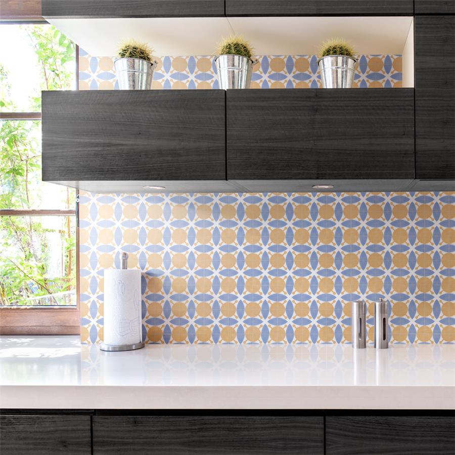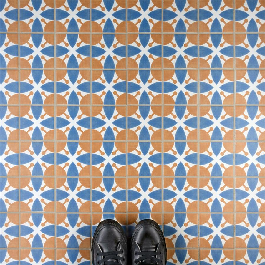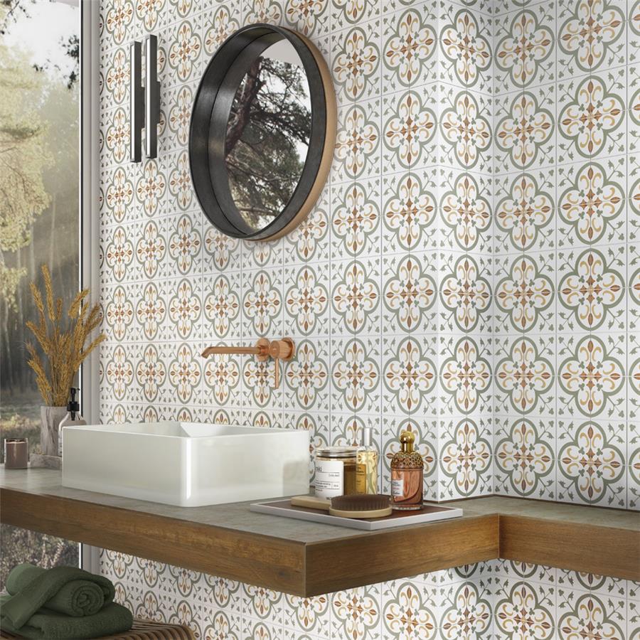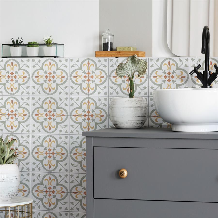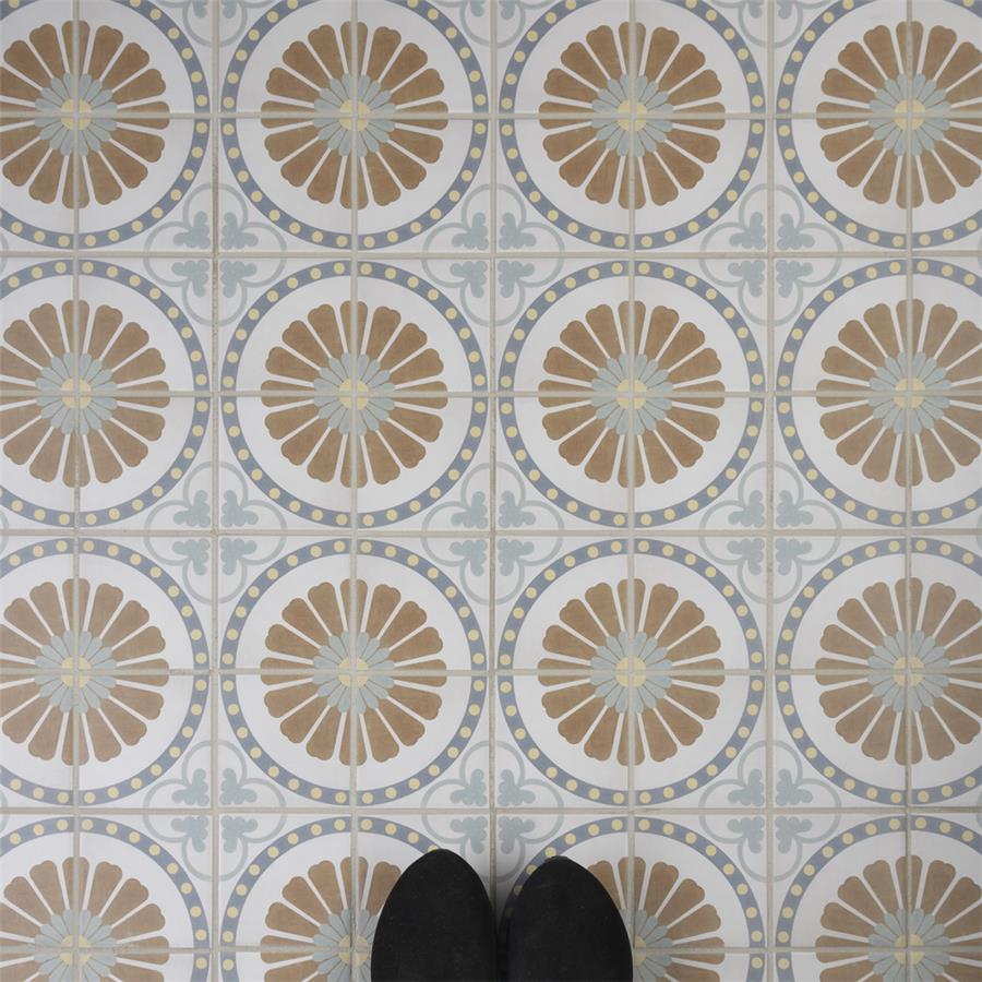 Ambiance (by sq. ft.) Ceramic Floor and Wall Tile transforms any space into a work of art through geometric and linear patterns that when laid out, intertwine to create captivating floral motifs. Inspired by our Revival 7-3/4 in. x 7-3/4 in. Ceramic Floor and Wall Tile, this smaller version is composed of rich detail and a smooth surface texture, this floor and wall tile features varying shades of faded orange, yellow, and blues on an off-white base glaze for additional visual dimension. Its durable and frost-resistant features make this an ideal choice for indoor and outdoor installations including kitchens, bathrooms, backsplashes, showers, entryways, patios and fireplace facades.