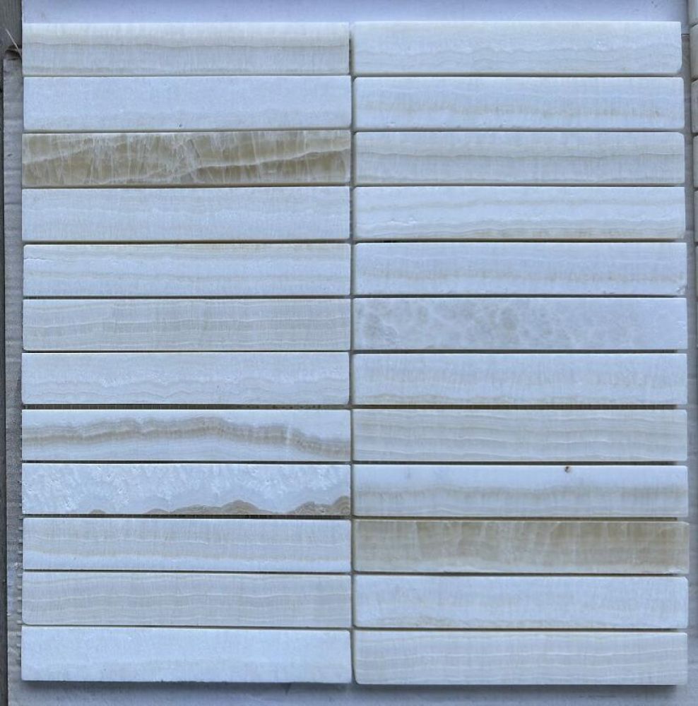 Forever (by sheet) Slot Calacatta – Calacatta Gold and Thassos marble blended into a stacked linear pattern. Slot Calacatta Long – Calacatta Gold and Thassos marble blended into a stacked linear pattern. Slot Crystal Ocean – Blue Crystal and Thassos marble blended into a stacked linear pattern. Slot Dolomite Honed – Made with Dolomite marble. Slot Italian Blue – Blue Italian Palissandro Marble in long slot shape. Slot Jade – Ming Green marble in linear shape. Slot Onyx Ivory – Straight Grain White Jade Onyx. Marble arrangements are not in any particular pattern.