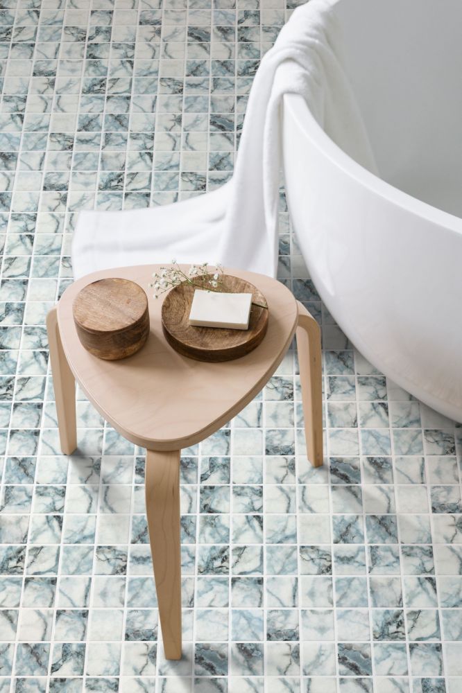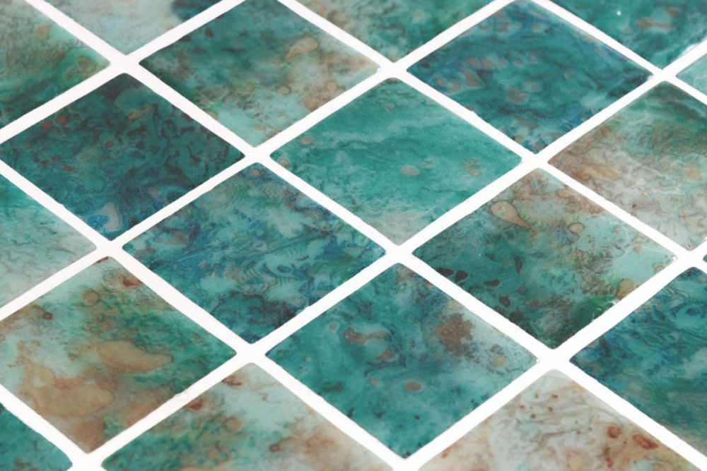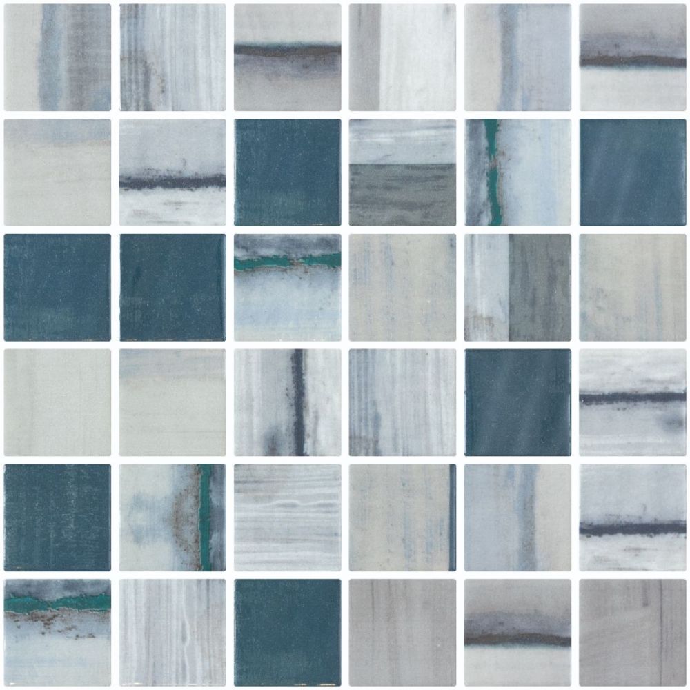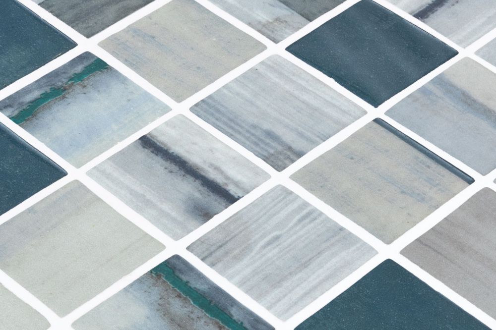 Elegance (by sheet) Vanguard Penta – Mosaic made of 98% recycled glass tile from Spain. Composed of 2×2″ squares. Pool Rated for use in Swimming Pools (Chlorine & Salt Water) (Bluish Grey has mixed finish with both matte and polished pieces.)